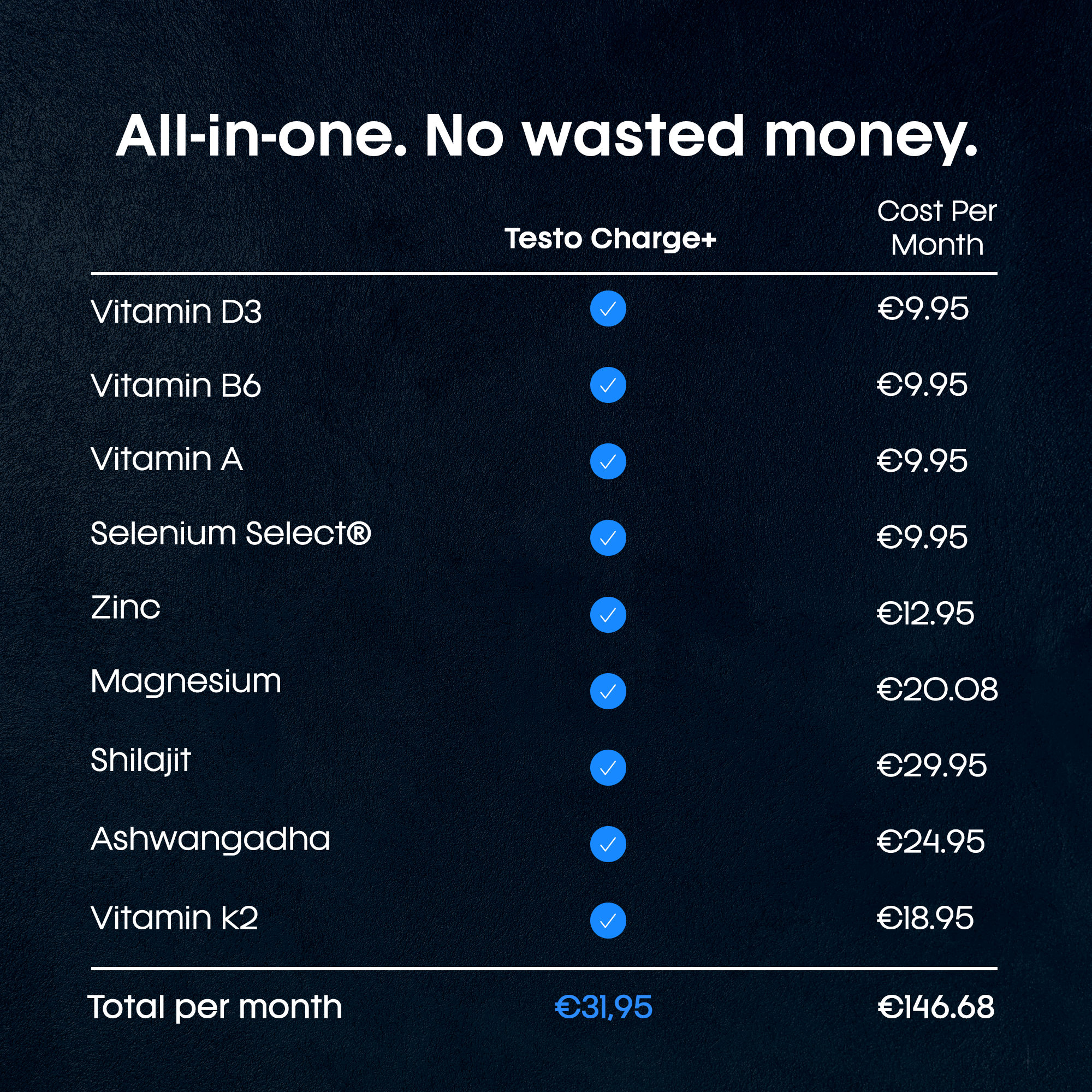 A subscription offers you maximum flexibility and convenience. With the Testo Charge subscription, you automatically receive a pack directly to your home every month - so you are always supplied and don't have to worry about reordering. You also benefit from exclusive discounts and save money in the long term. The subscription is flexible and can be easily sent via email at any time klantenservice@zapply.nl be terminated. Ideal for everyone who wants to maintain their peak performance permanently!